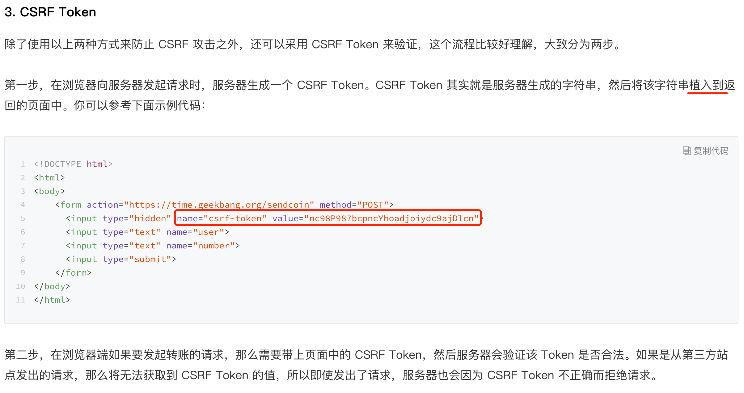 - 浏览器向服务器发起请求,服务器返回一个 CSRF Token,植入到页面中